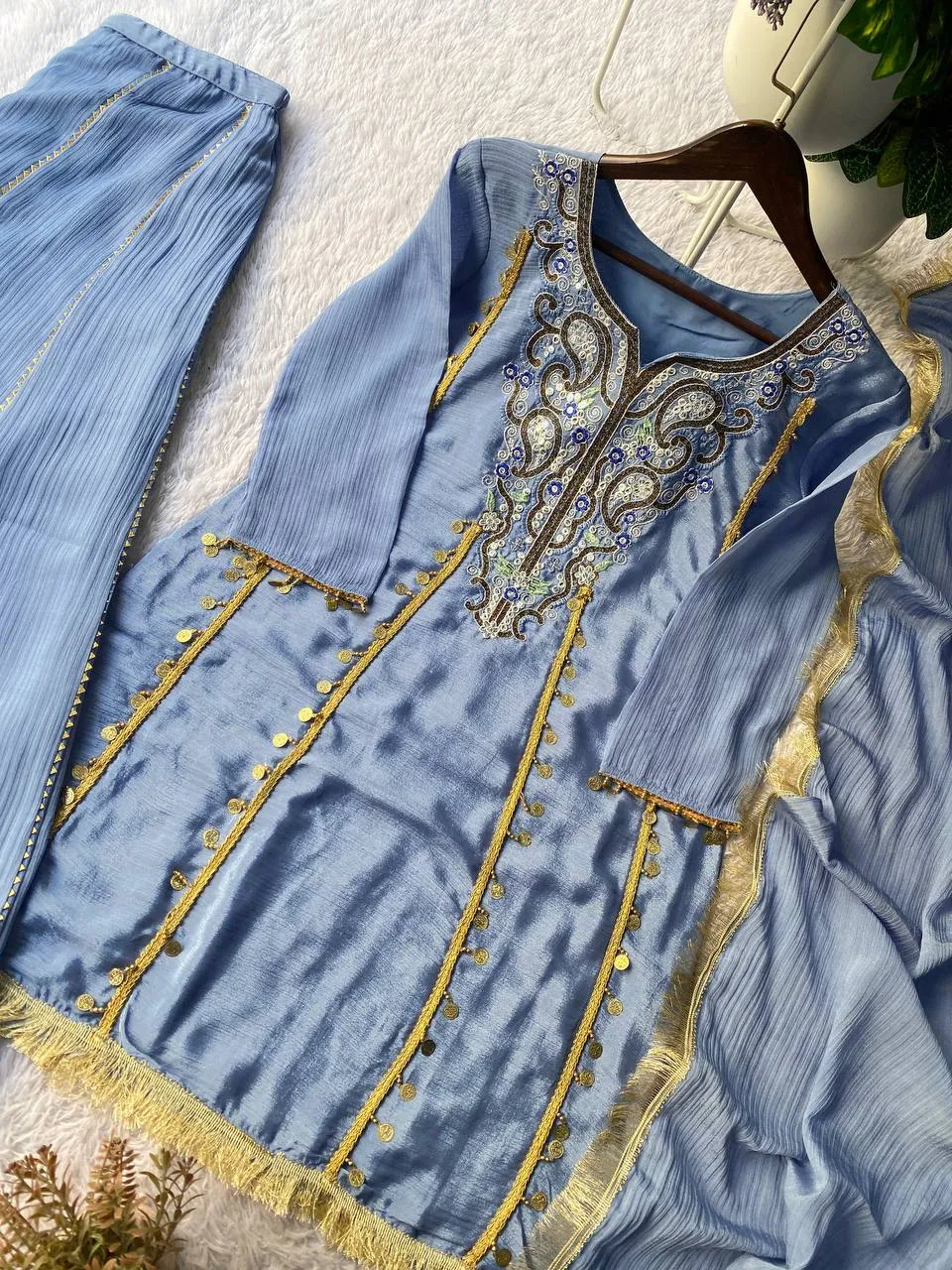| Top | CHINON, WORK- SEQUENCE EMBROIDERY WORK GOLDEN COIN LACE, INNER- MICRO, HEIGHT- 37”inch |