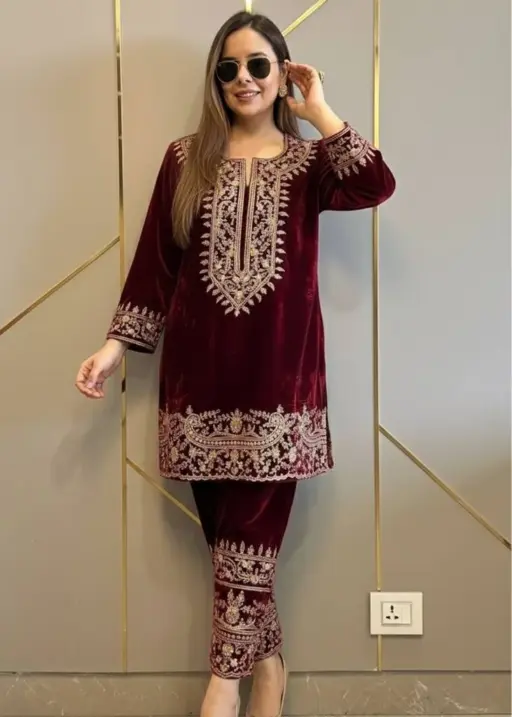 C585 1428 Velvet Designer Co Ord Set With Zari Embroidery