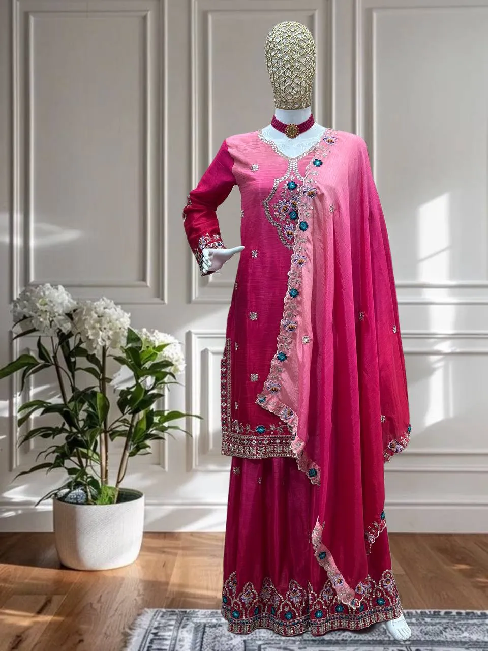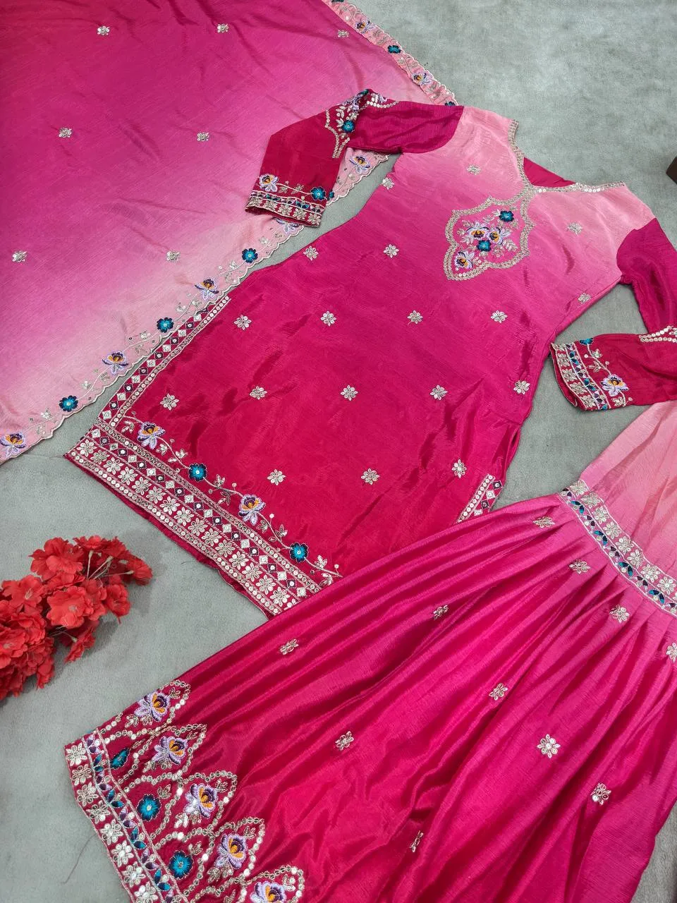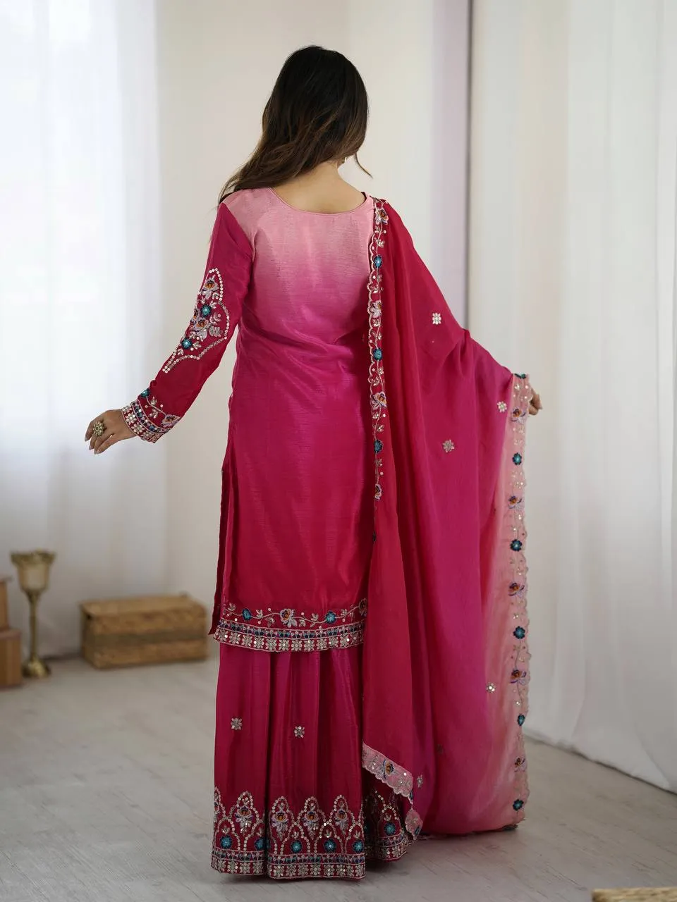 | Dupatta | Chinon Pedding Silk, Work- Embroidery Sequence Design Work |