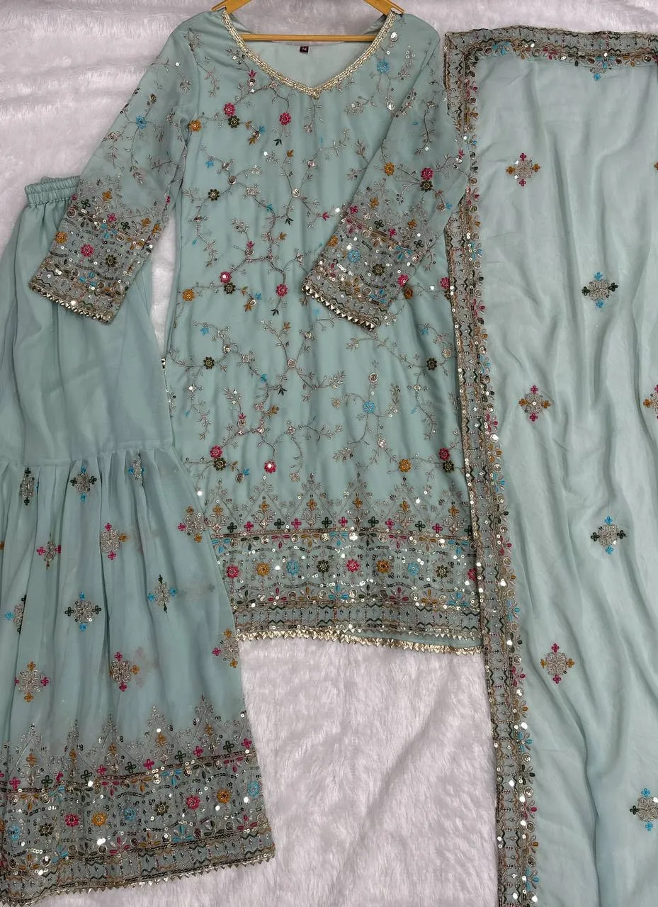TopFaux Georgeet, Work- Embroidery Thread Sequence Zari, Chest Size- M(38),L(40),XL(42),2XL(44), Length- 41”, Sleeve- 19”