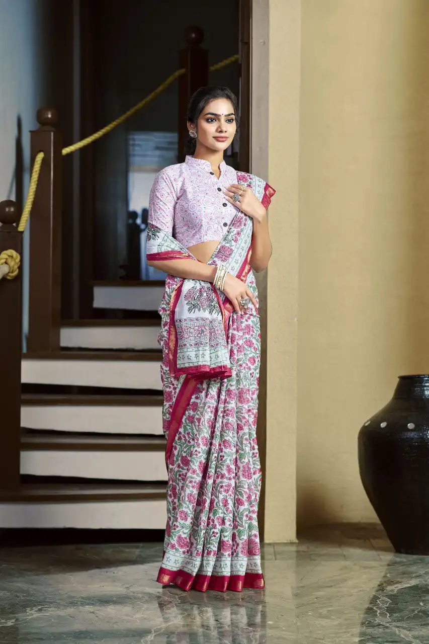 SareeMulmul Silk Pure Cotton With Zari Border, Cut- 6.3 Meters
