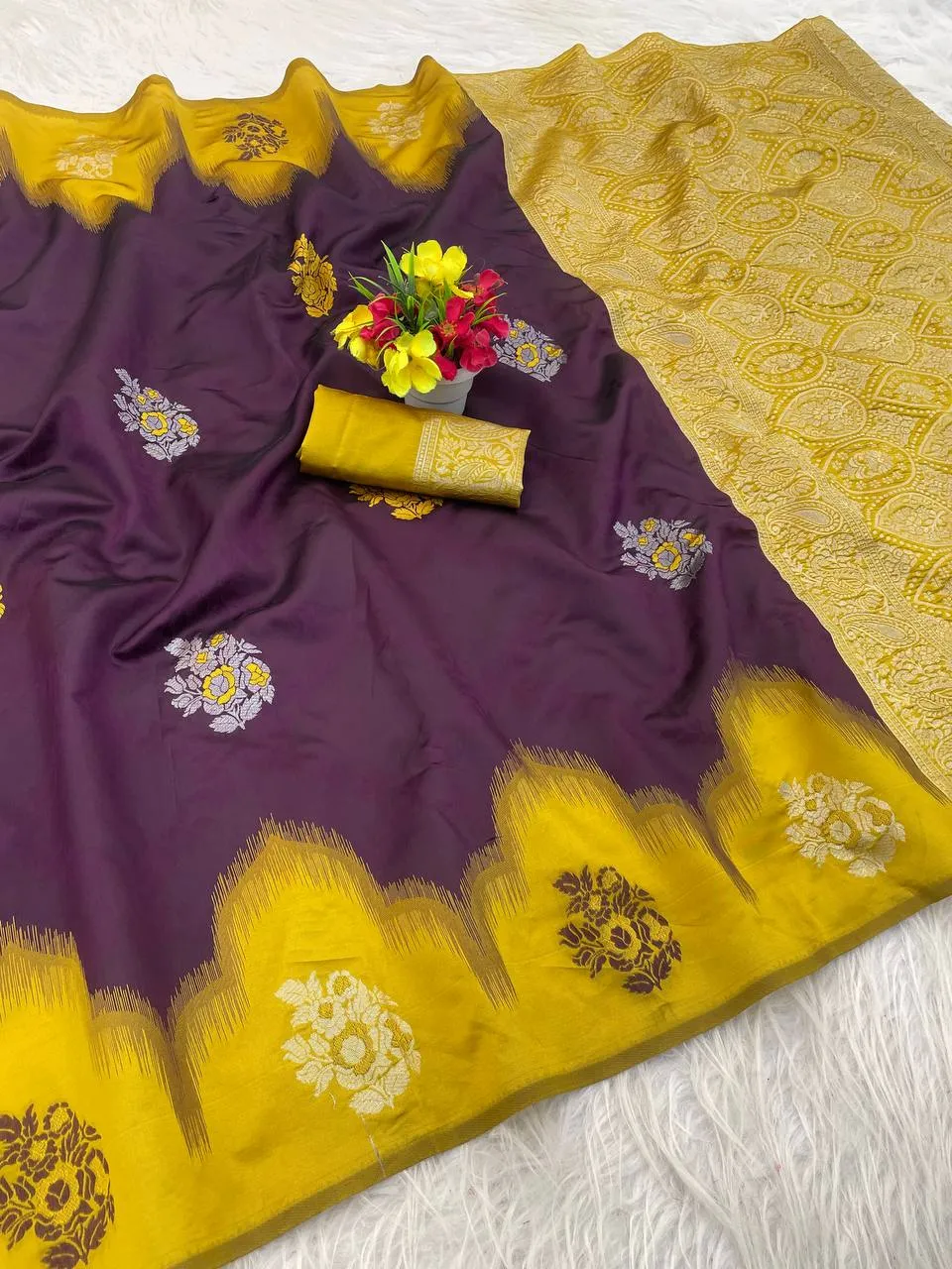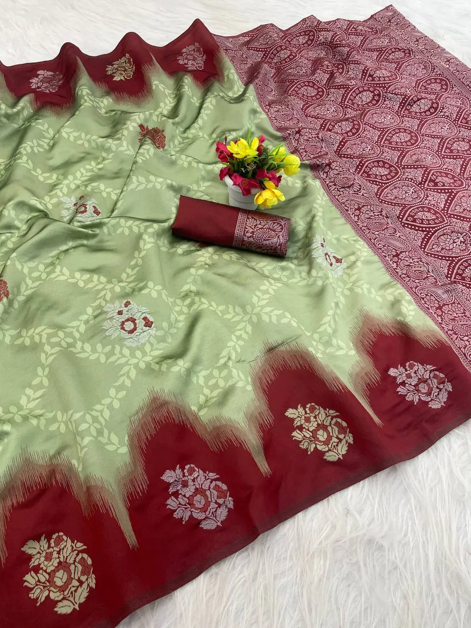 | Saree | Soft and pure banarasi silk saree with FLOWERS AND MINA design all over the saree & zari weaving Rich pallu with zari weaving unique border & heavy rich Pallu |