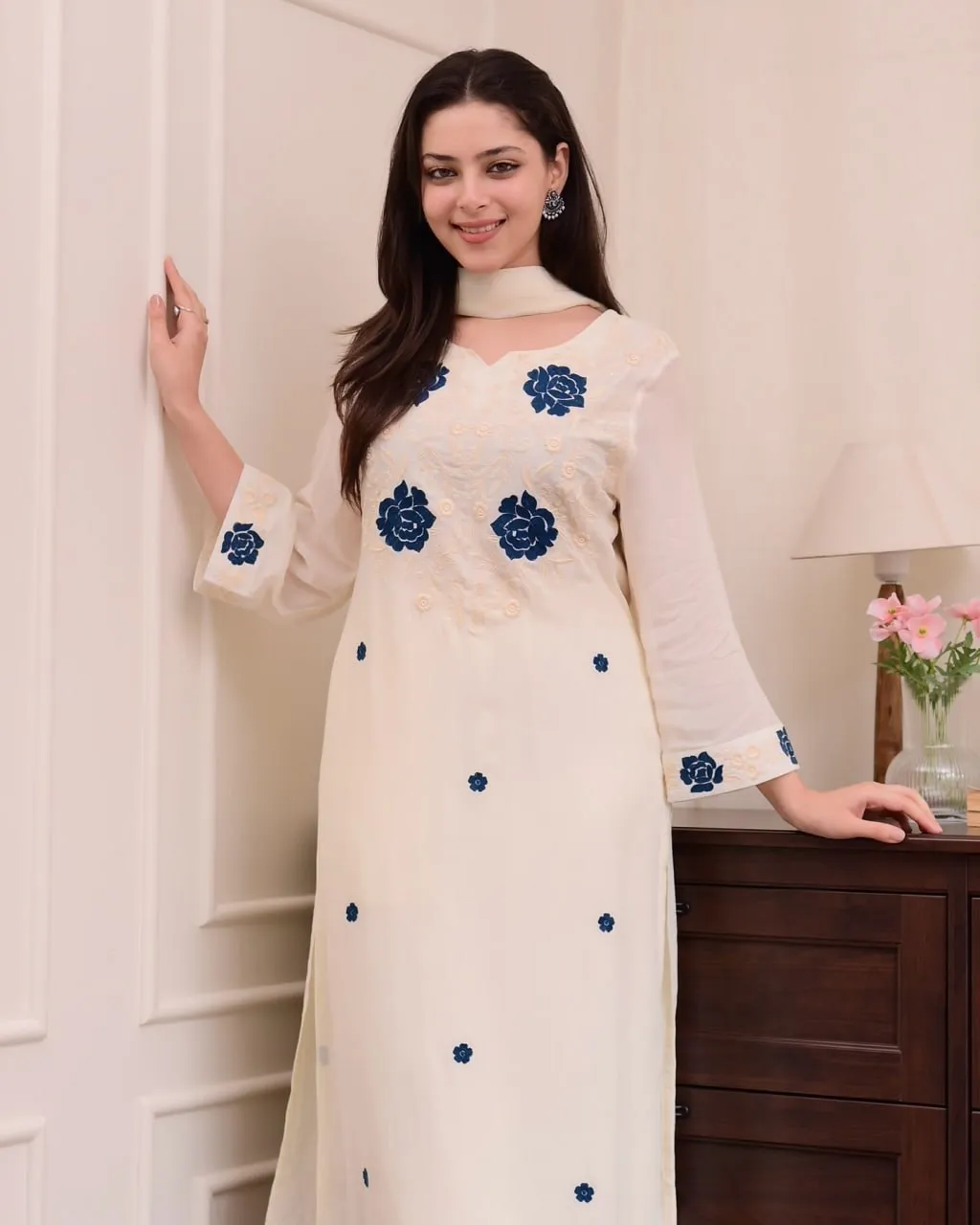 | Top | Viscose with embroidery, Neckline- as per image with embroidery, Sleeves- Viscose with embroidery |