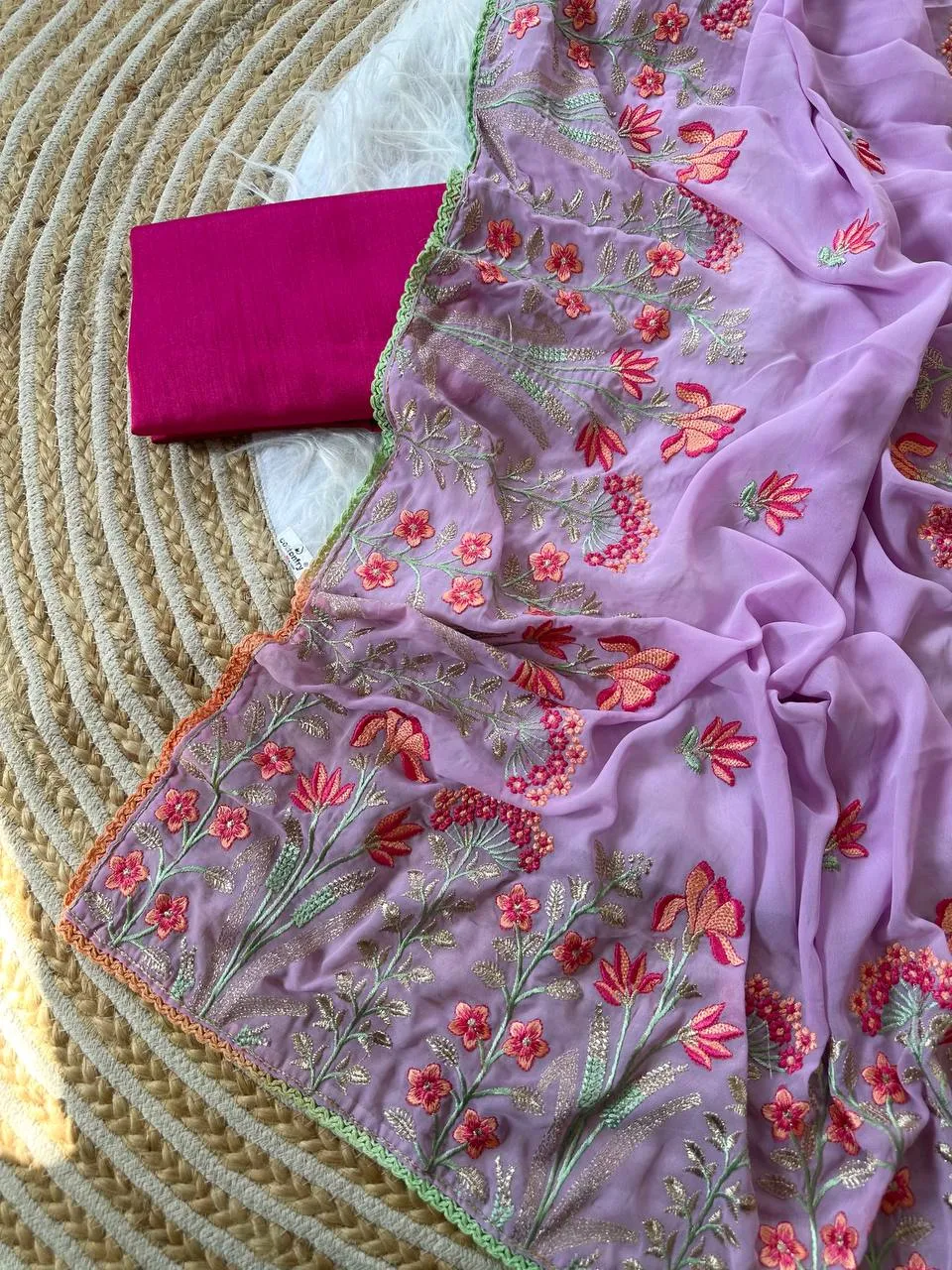 SareeGeorgette, Multi color lace border, Embroidery work has been done by viscose thread work in all over saree