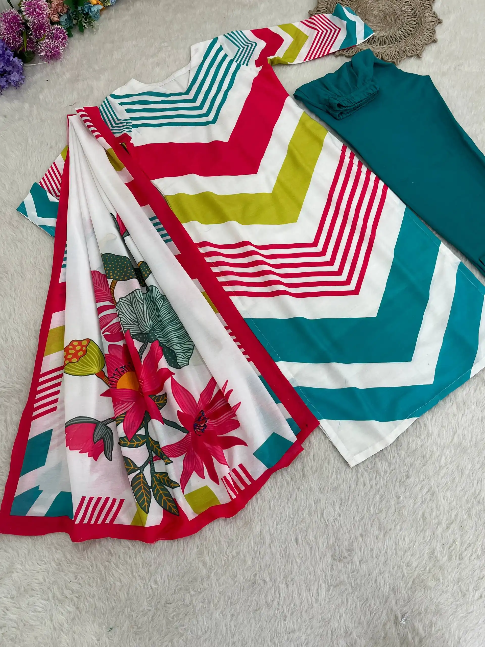| Top | Premium Soft Muslin Fabric With Vibrant digital print | Sleeve- 3/4 | Inner : Cotton Inner (Full) |