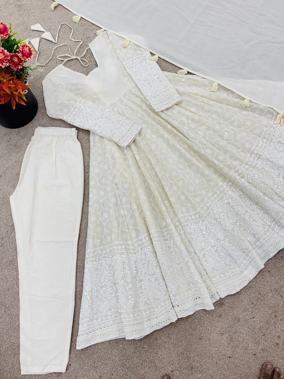 | Product Name | Sabina 5332 Kora Cotton Schiffli Work Anarkali Gown Pant With Dupatta |