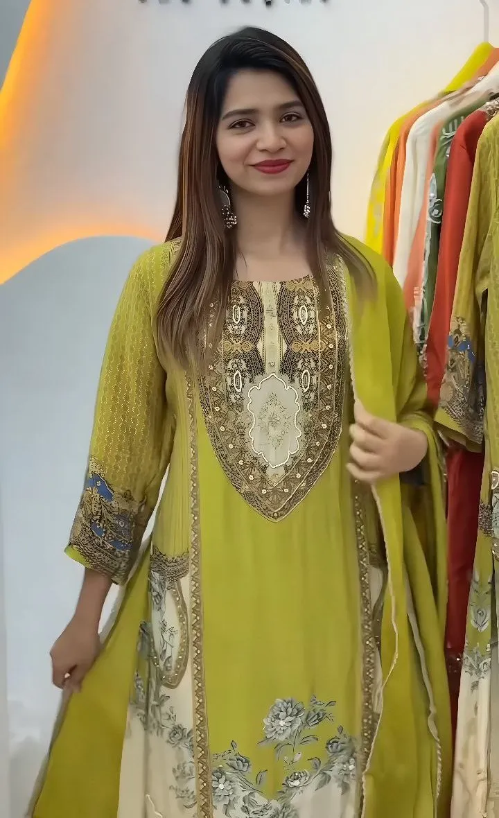 | TOP | – Heavy Frech Crepe With Digital Print With Hand Work With Full Sleeves . |
