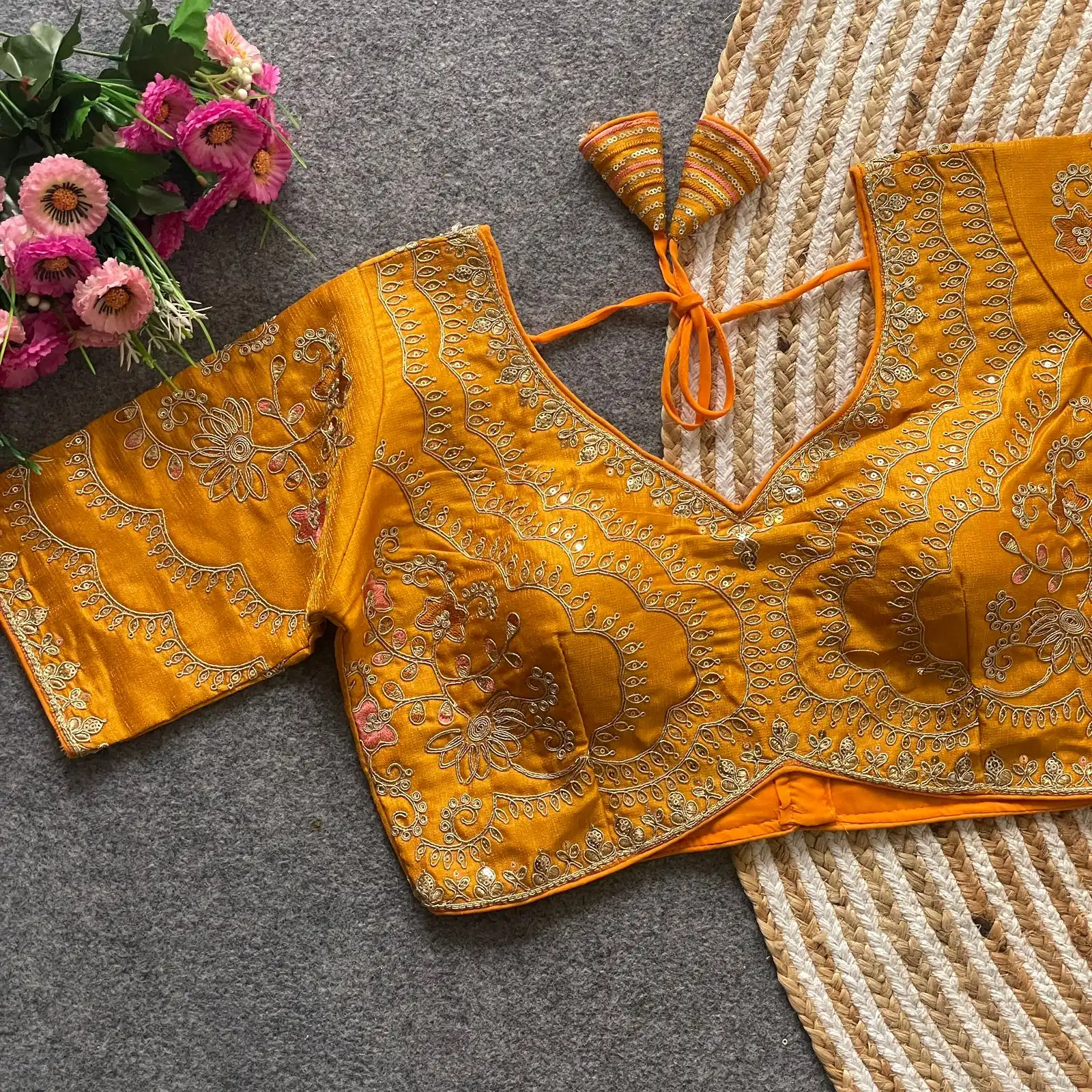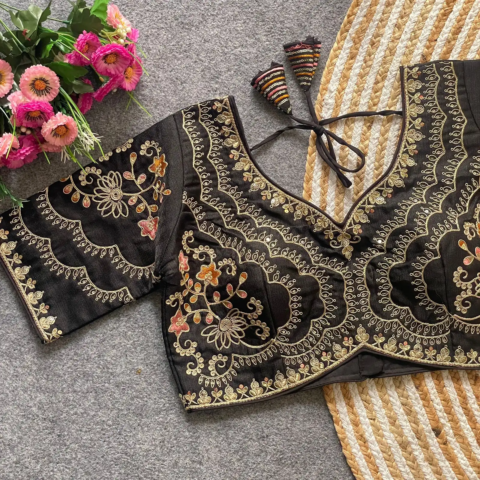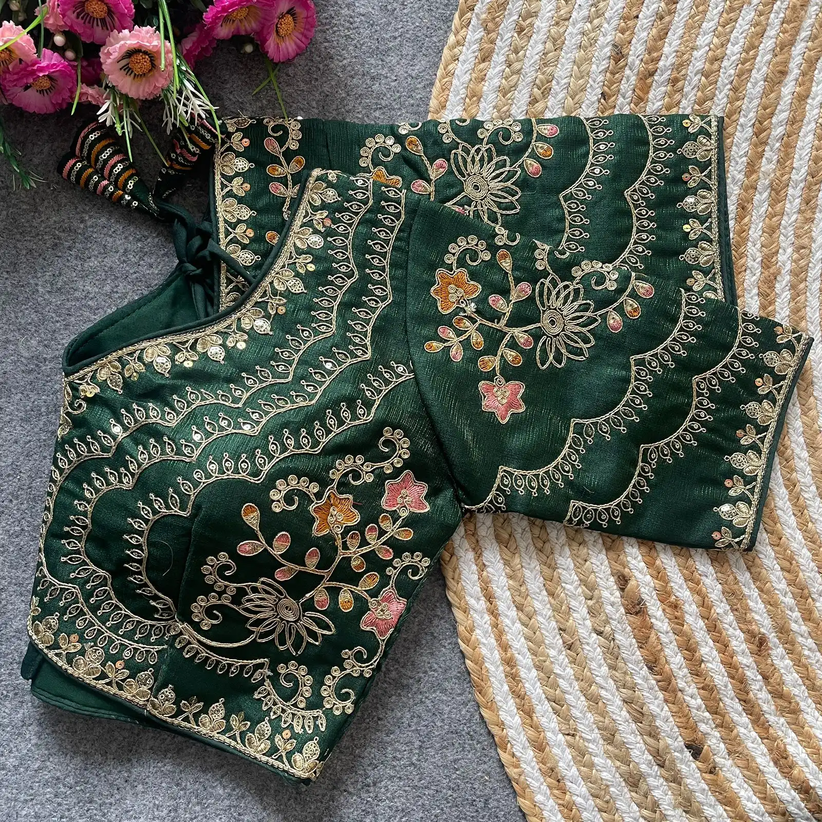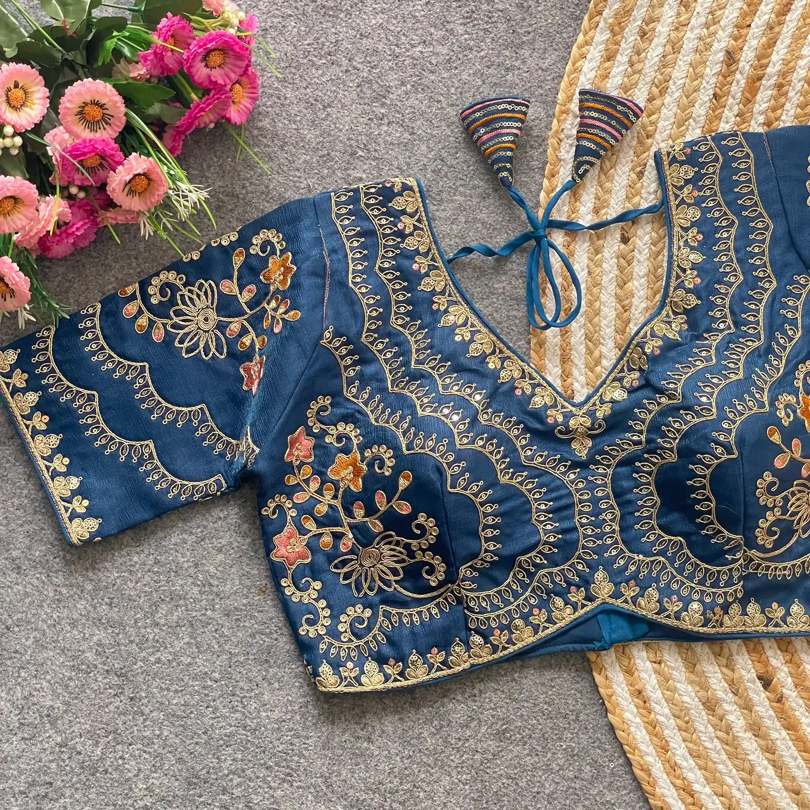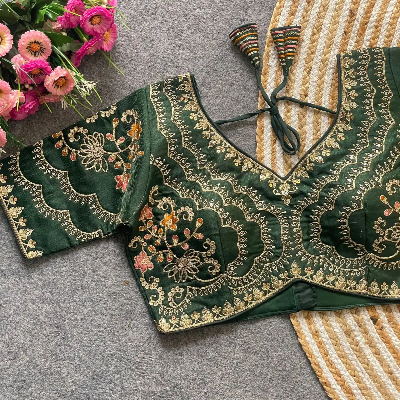 | Blouse | Heavy Pure Soft Timo Slub With Tricot Fuising, DESGINE- Heavy Stitching Heavy Padded Handmade Hooks With Beautiful Latkans Back open Style, Heavy Codding Embroidery + Thread & Sequence Work, SIZE-Plus Size 38 Ready ulter upto 40 Inch. |