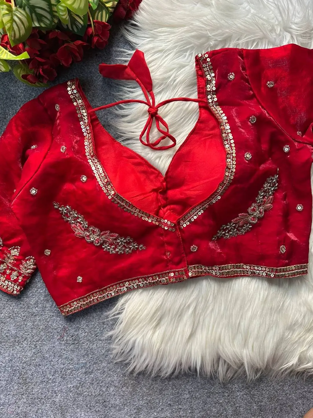 | Blouse | Heavy Pure Fendi Silk, SLEEVES- 12 in Long, DESGINE- Heavy Stitching Heavy Padded Handmade Hooks With Beautiful Latkans BACK open Style, SIZE- 38” Ready Alter Upto 40 Inch. |