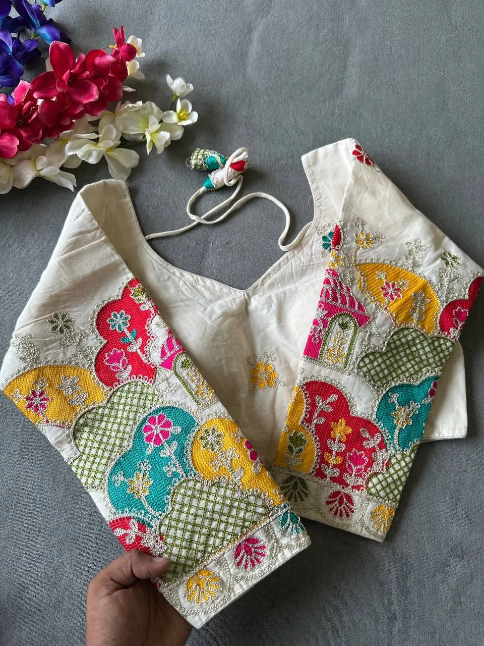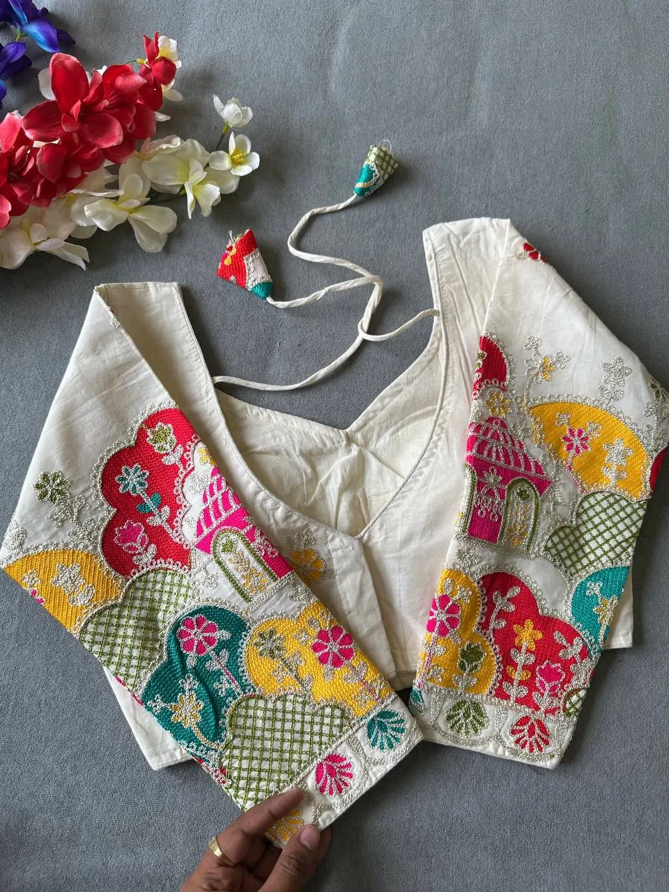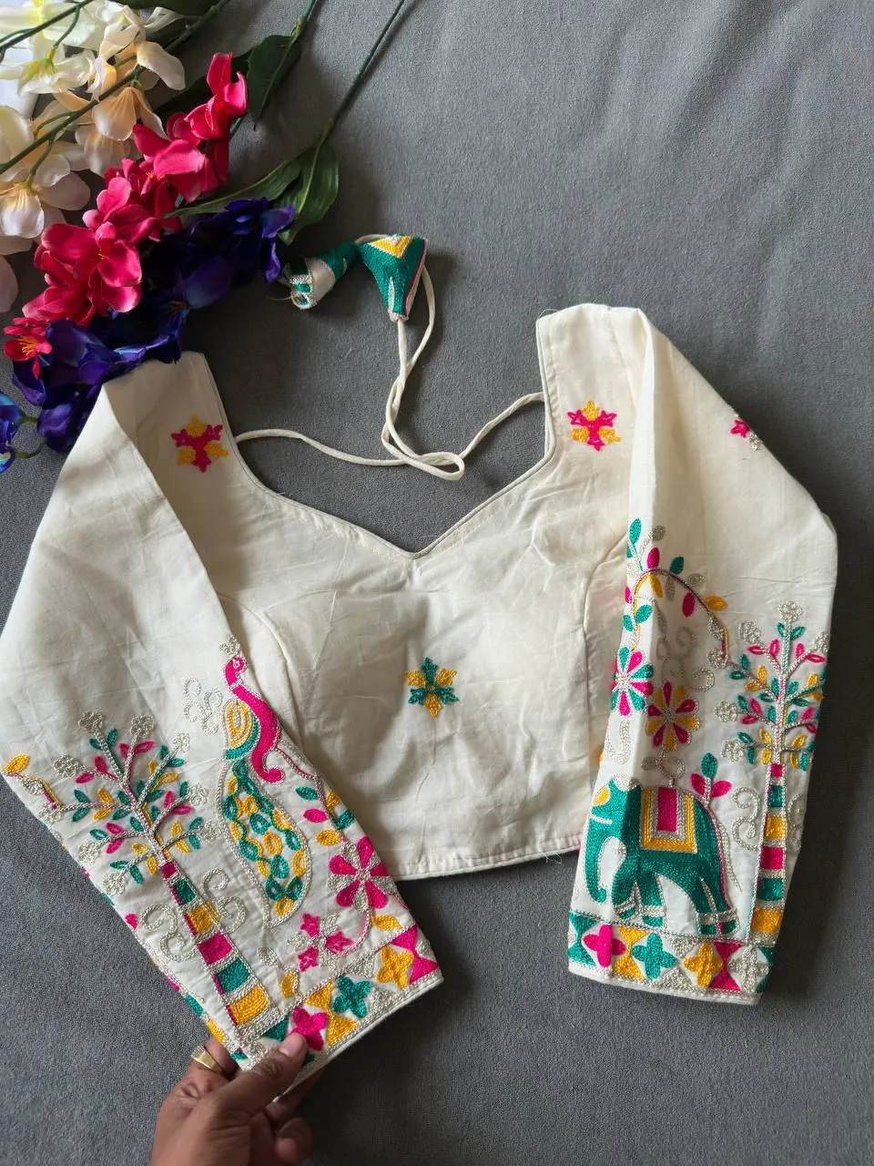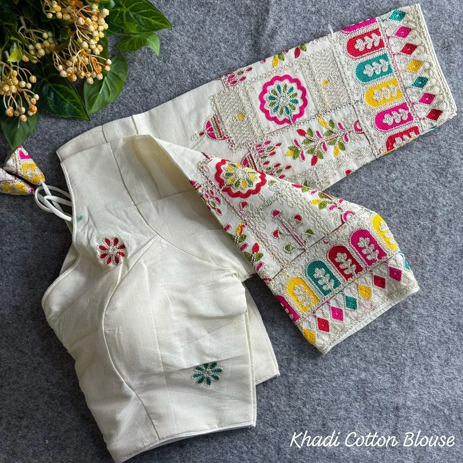| Blouse | Pure Khadi Cotton, SLEEVES- 17 Inch Sleeve, DESGINE- Beautiful Blouse Heavy Stitching Heavy Padded With Beautiful Sleeves BACK open Style, Chain Stitch Embroidery Blouse |