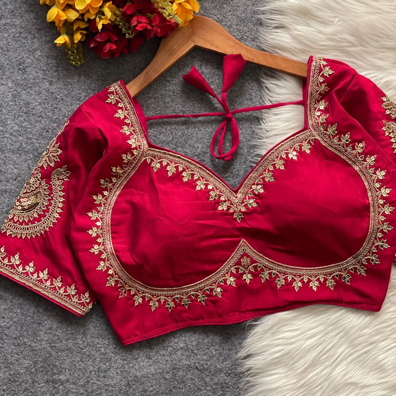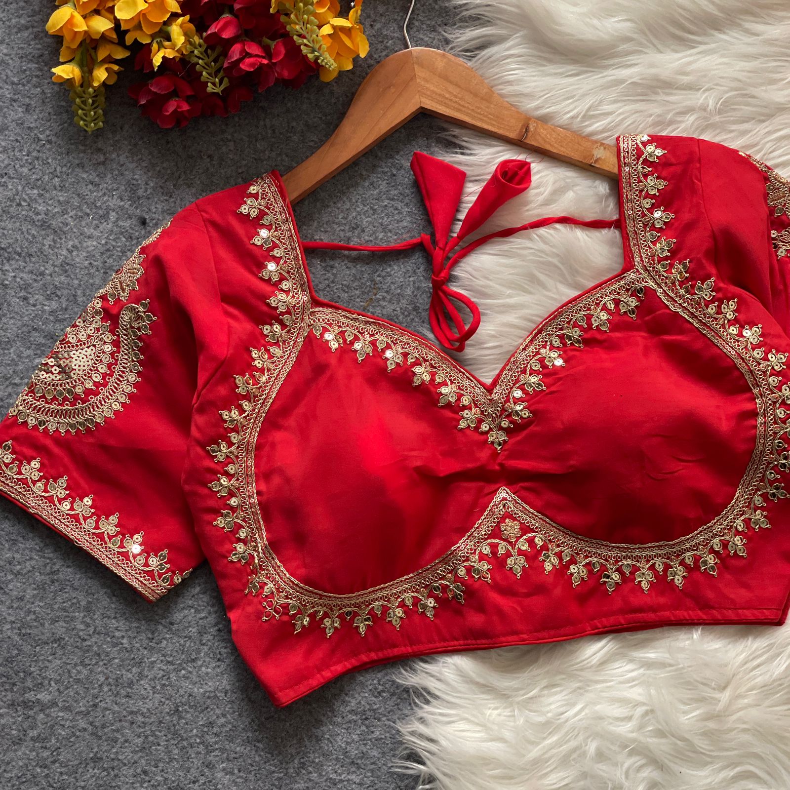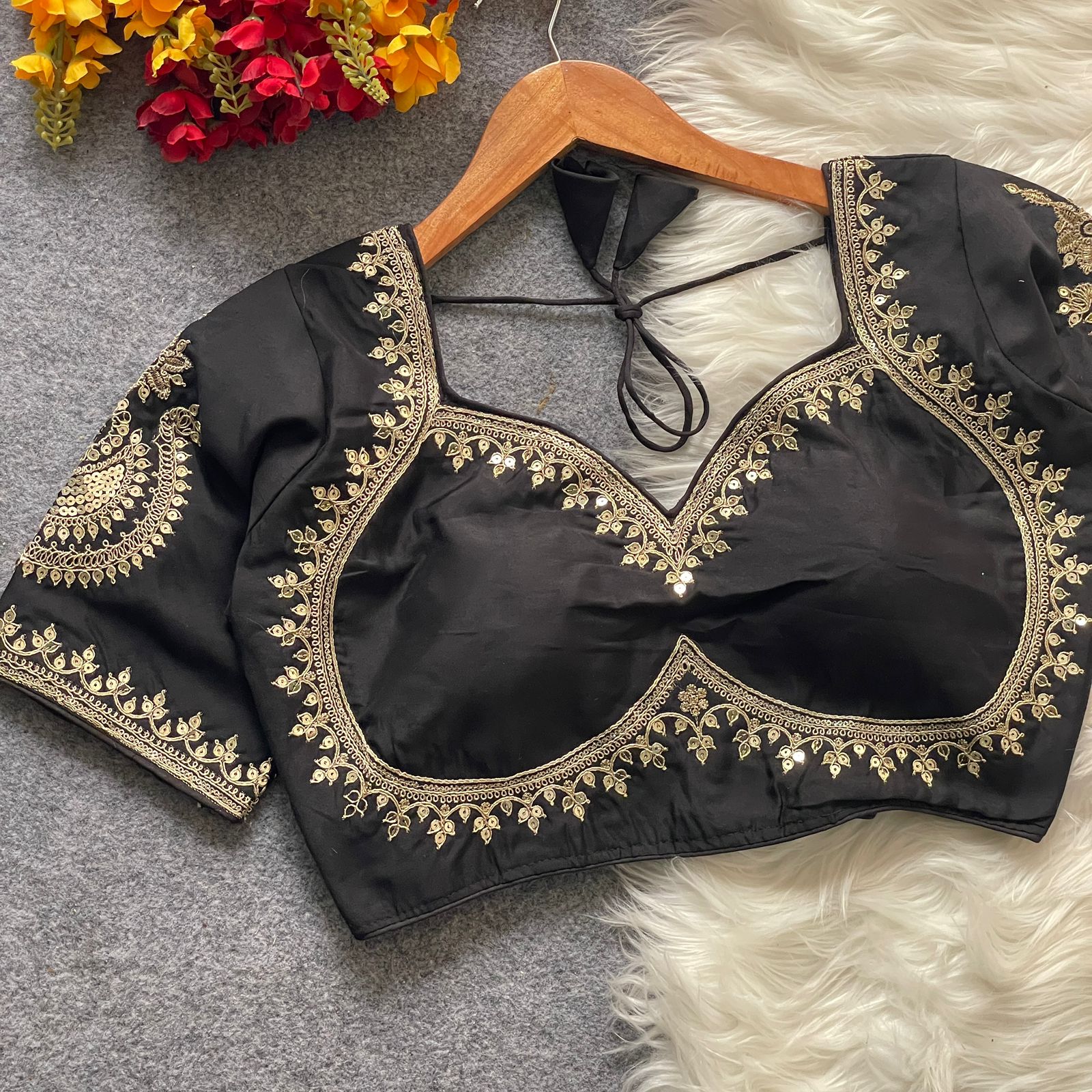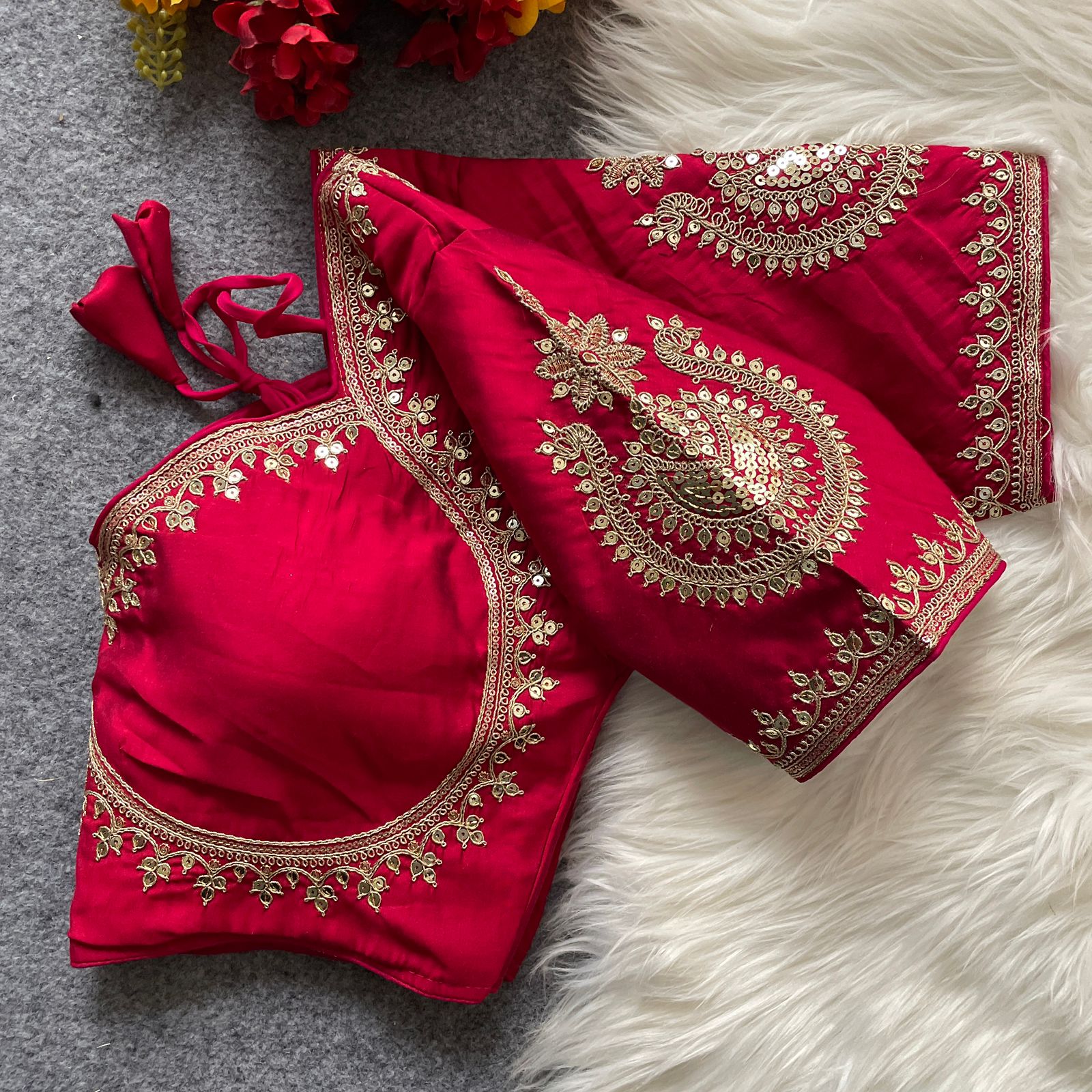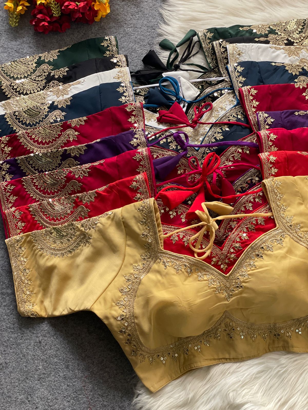 | Blouse | Heavy Pure ROMAN Silk, DESGINE- Heavy Stitching Heavy Padded Handmade Hooks With Beautiful Latkans BACK open Style, Heavy Jari Embroidery & Sequence Work, SIZE-Plus Size 38” Read upto 42 Inch. |