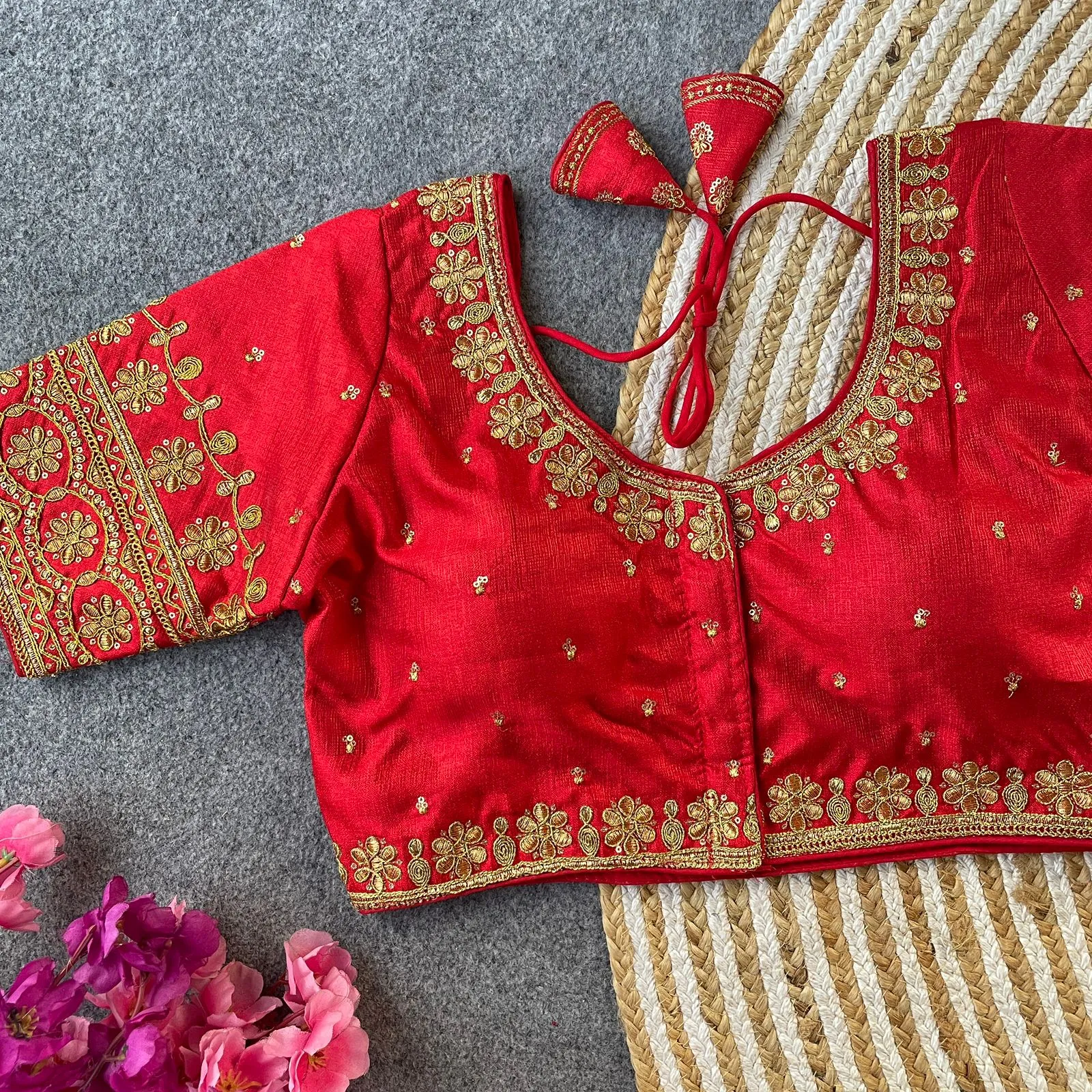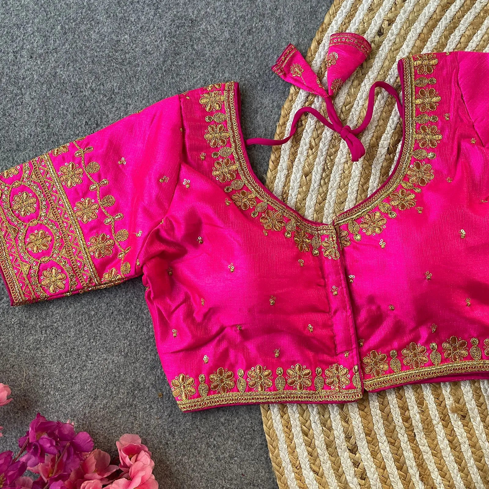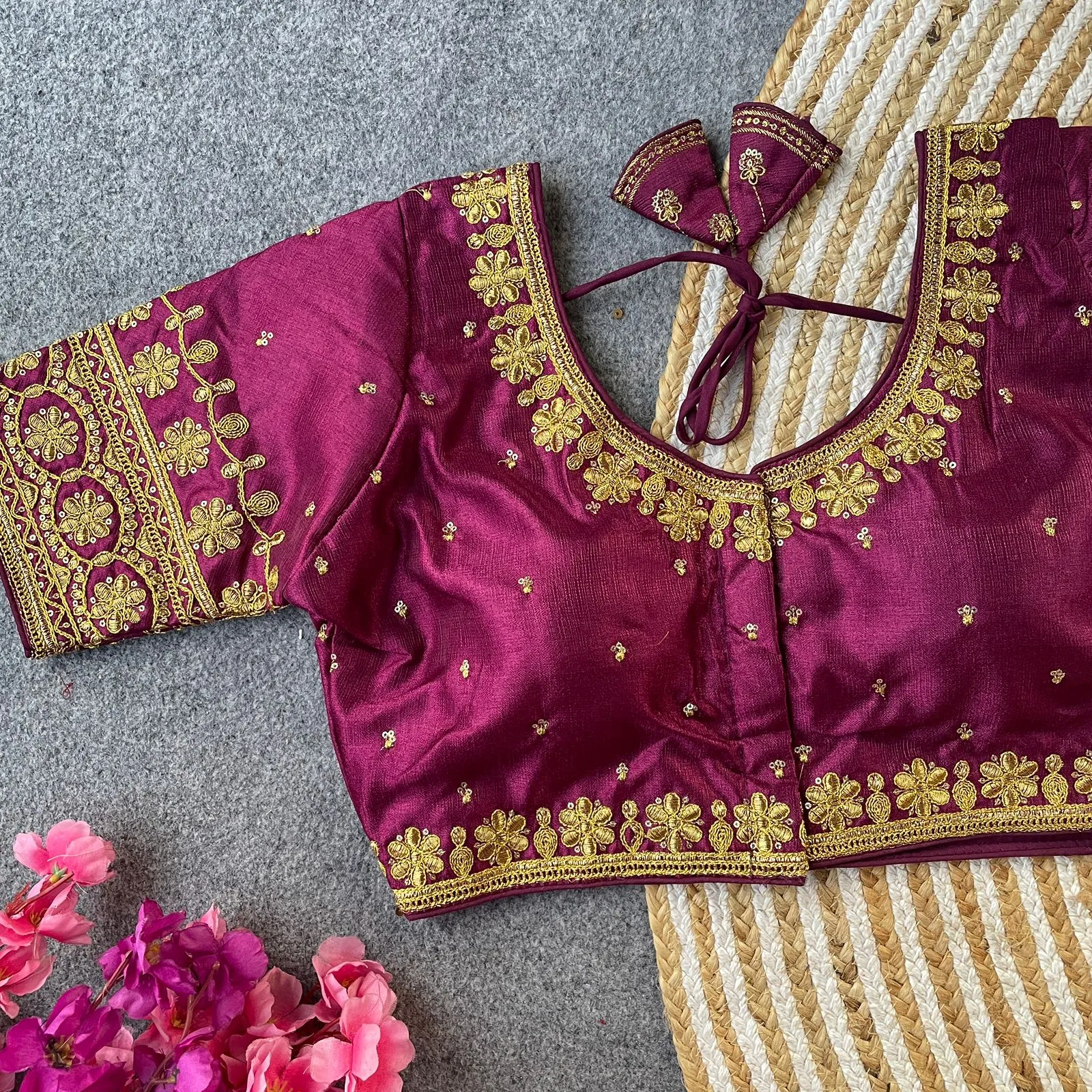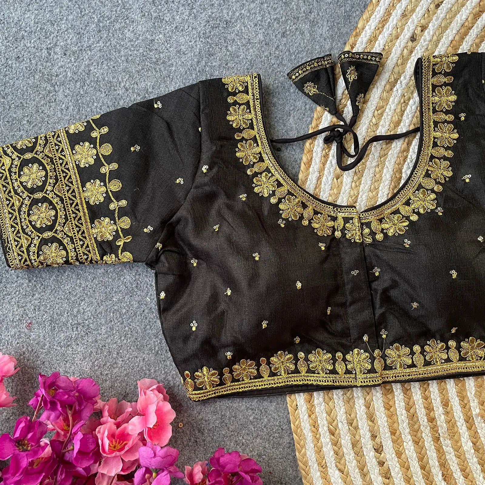 BlouseHeavy Milan Silk., SLEEVES- 12 Inch Sleeves, DESGINE- Heavy Embroidery Heavy Stitching Heavy Padded With Beautiful Work FRONT open Style, SIZE- Size 40” Ready Alter upto 42 Inch.