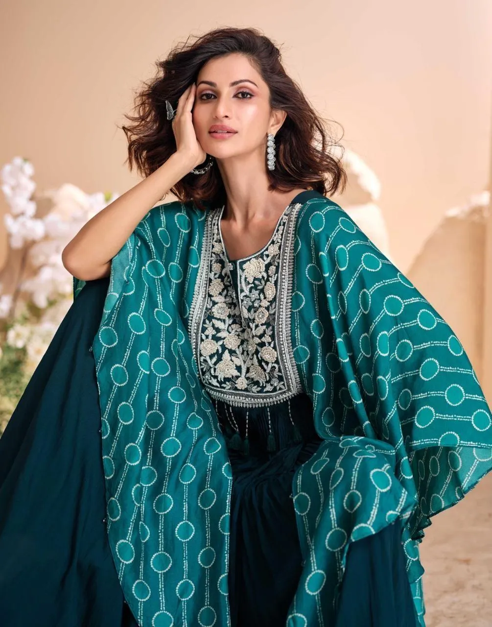 DetailsPremium Real Chinnon Silk (Full Heavy Look Hand Moti Embroidered Chinnon Silk Gown with Digital Sleeves)
