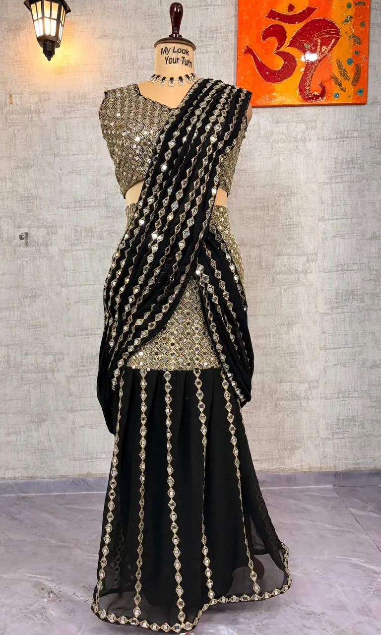 | Saree | Premium Faux Georgette, Work- Embroidery Sequins Work real mirror & Ready to wear, Size- Stitched Saree (XL) with 2-inch margin up to 44 size |