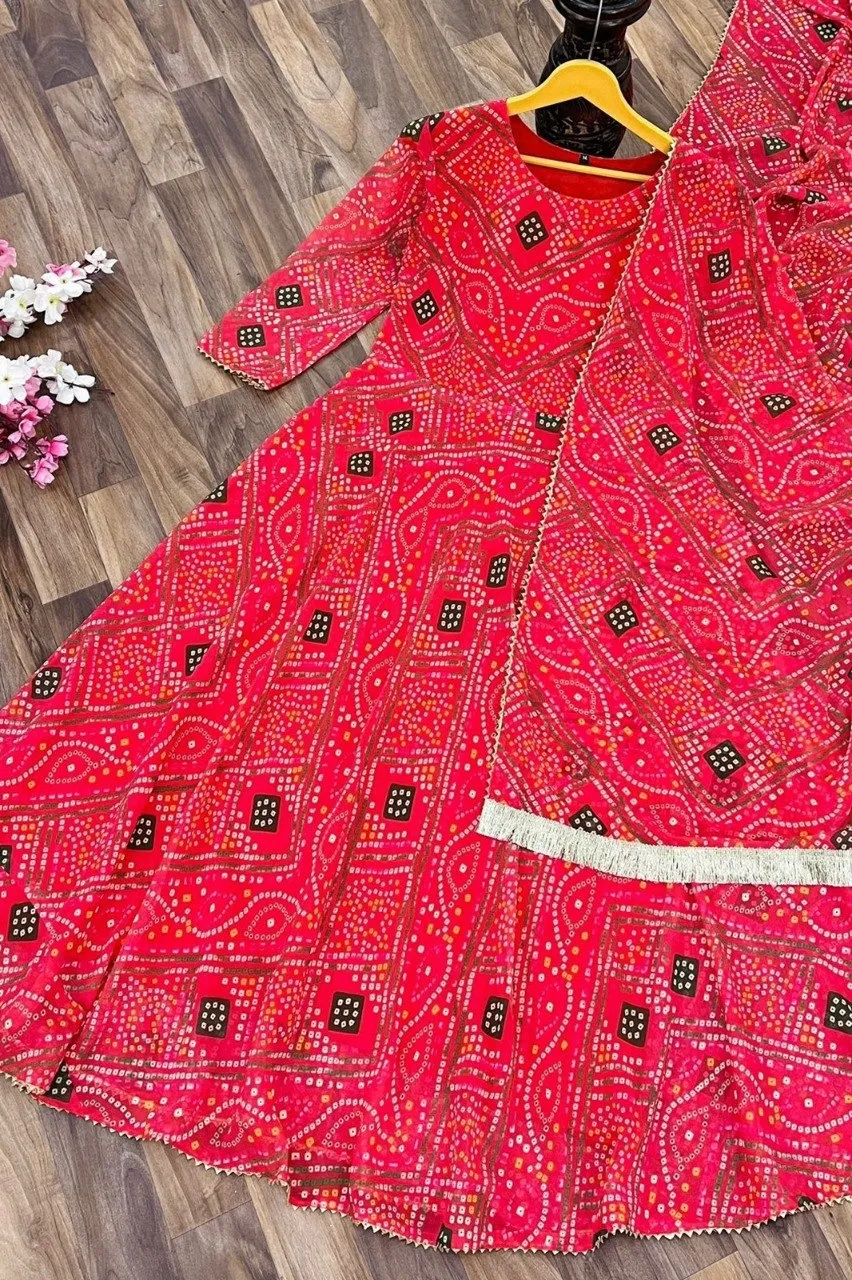 | Gown | Delta silk With inner crepe, Pattern: bandhani Printed, Length: calf Length, Shape: Flared, Neck: V- neck, Sleeve Length: Long Sleeves, Sleeve Styling: Regular Sleeves, Bust: M(38), L(40), XL(42), 2XL(44), Length: |