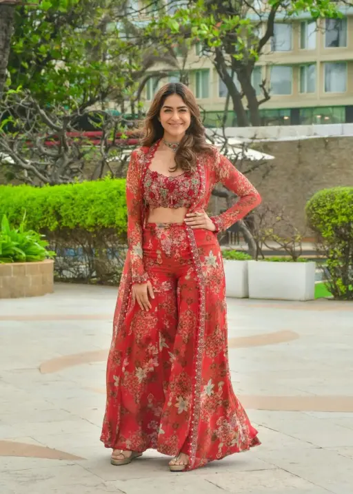 BDB 38 Mrunal Thakur Red Designer Bollywood Shrug Sharara Dress