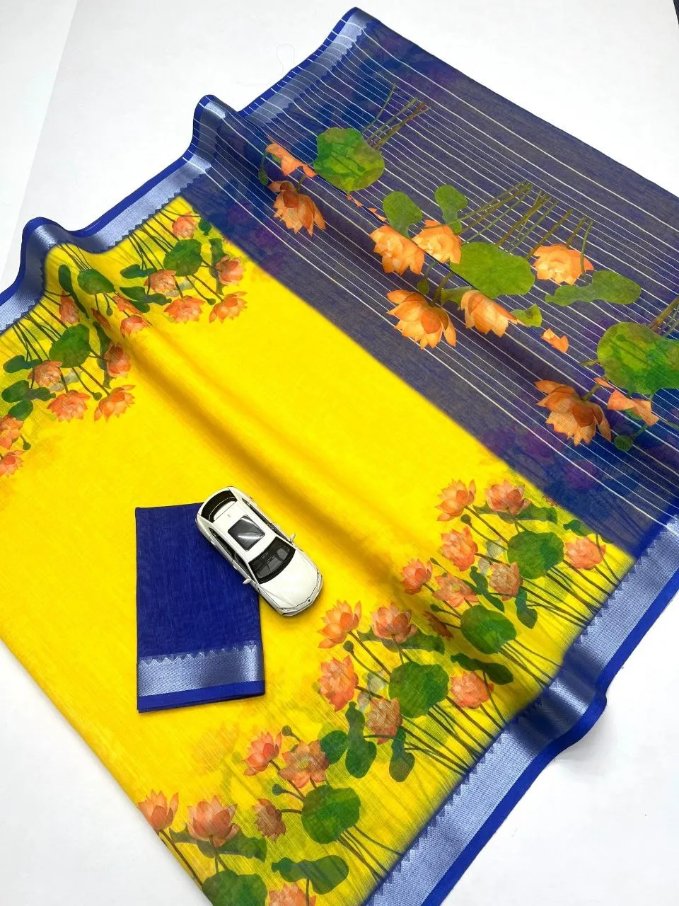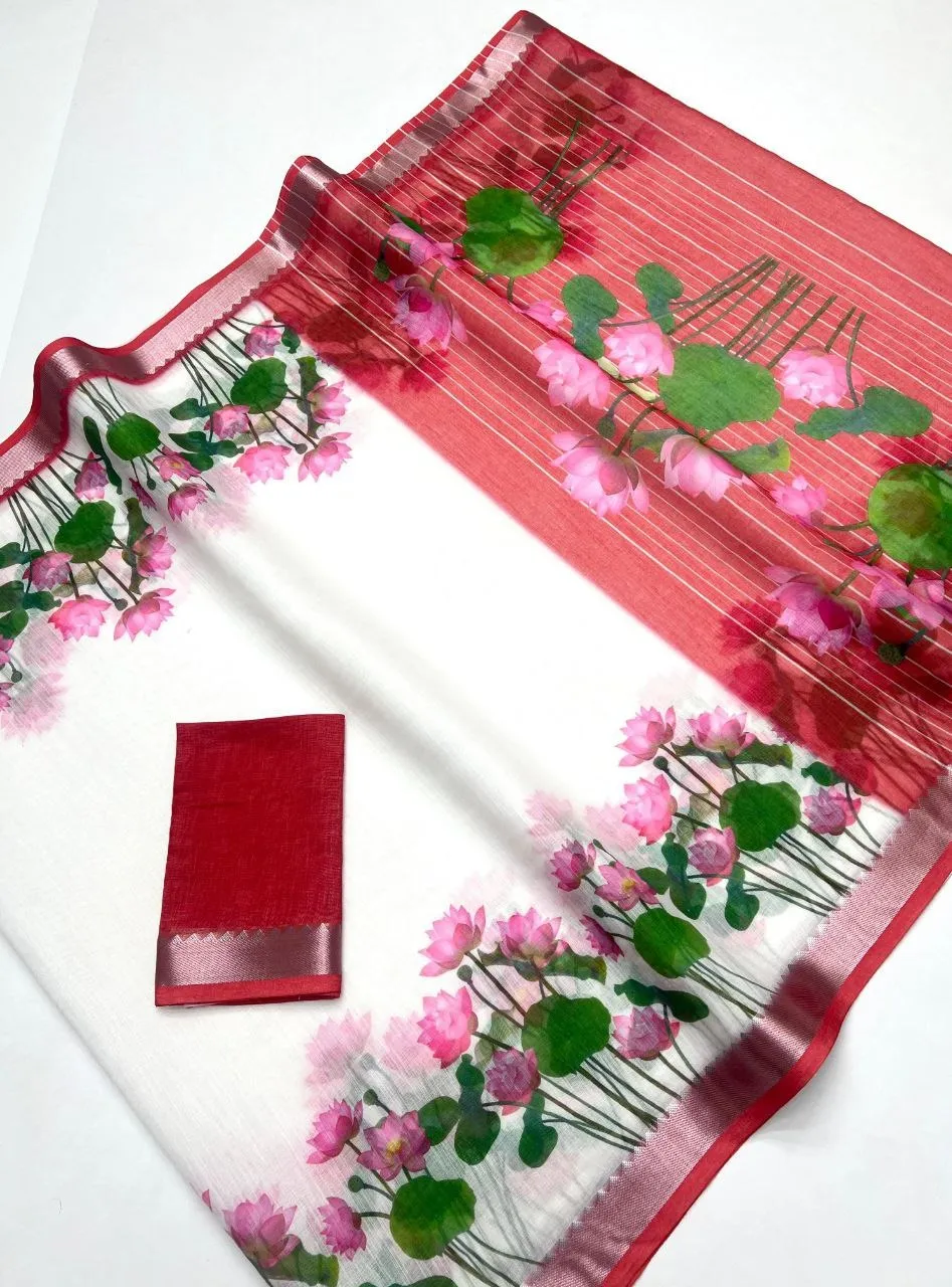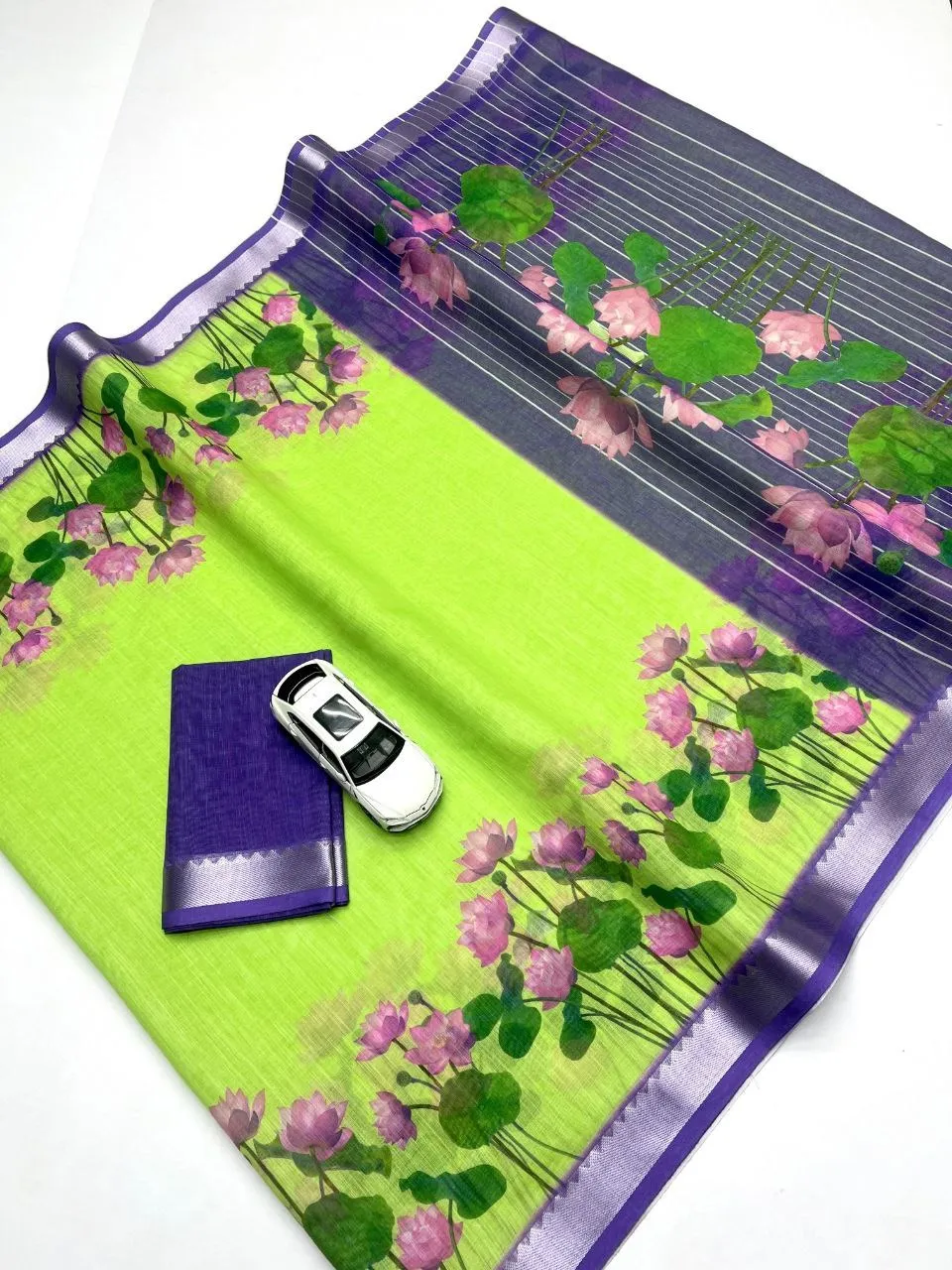 | Saree | Soft Linen with Jequard border , Work- Digital Print , length- 6.30 Meter |