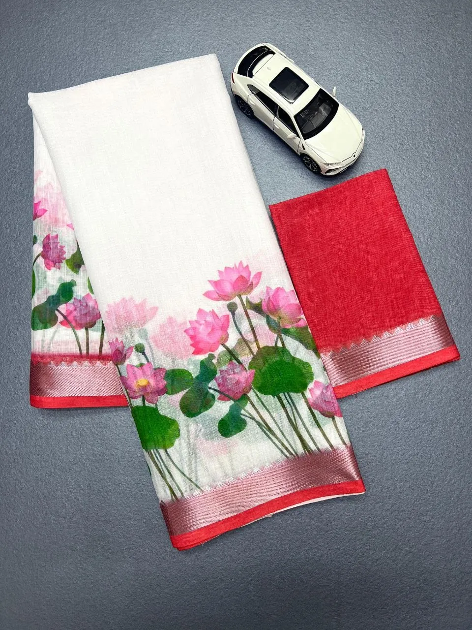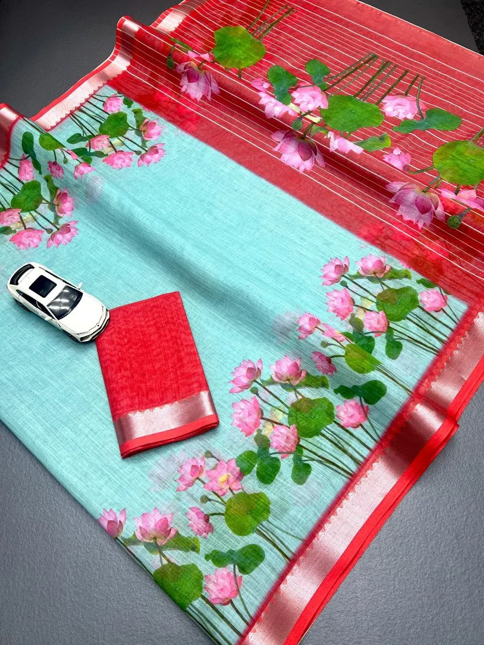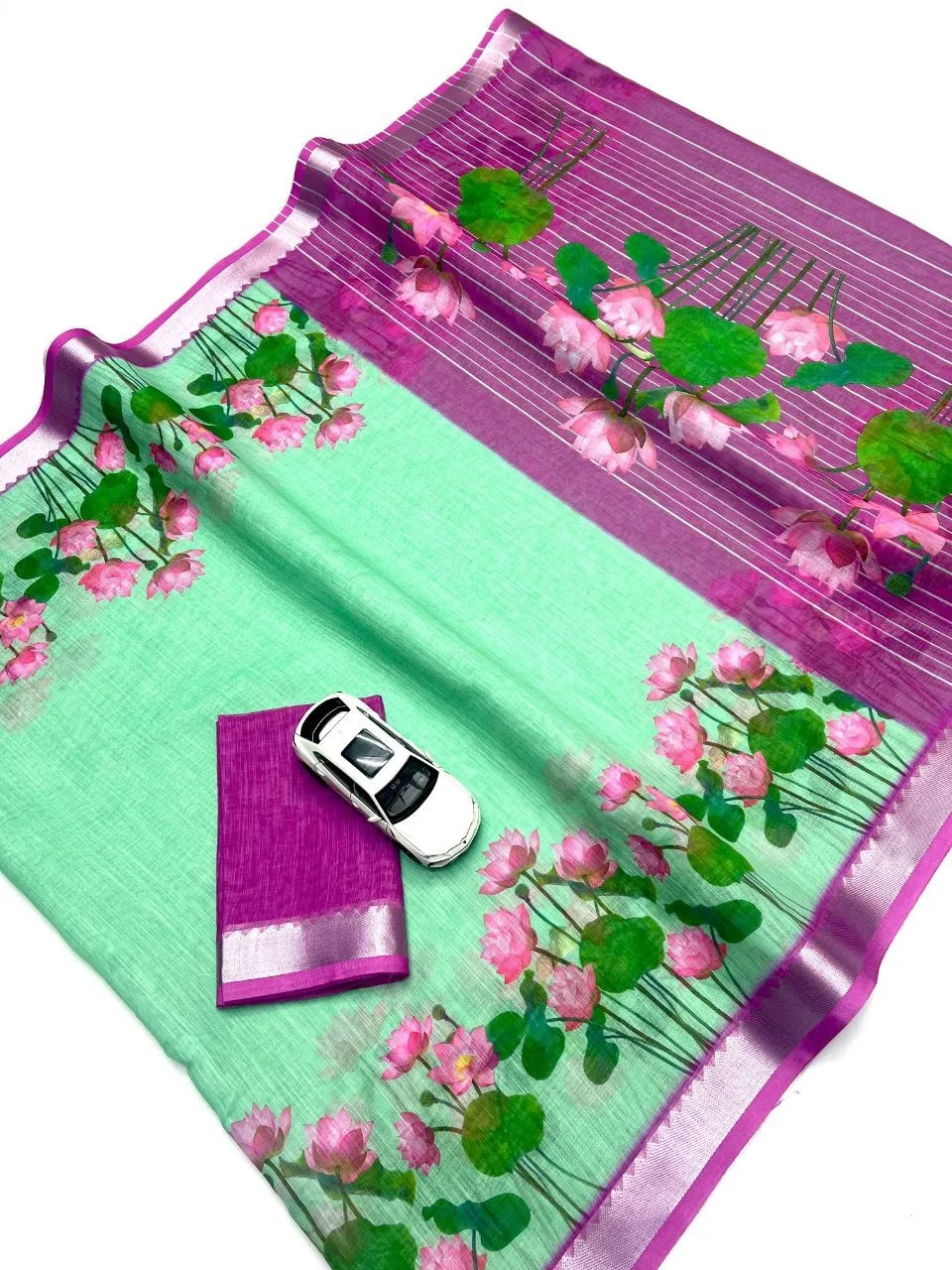 | Saree | Soft Linen with Jequard border , Work- Digital Print , length- 6.30 Meter |